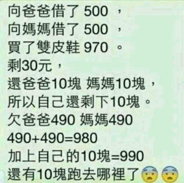 2、10块钱那去了?向爸爸借了500,向妈妈借了500, 买了双皮鞋用了970。 剩下30元,还爸爸10块, 还妈妈10块,自己剩下了10块, 欠爸爸490,欠妈妈490, 490+490=980,加自己的10块是990,还有10块呢?